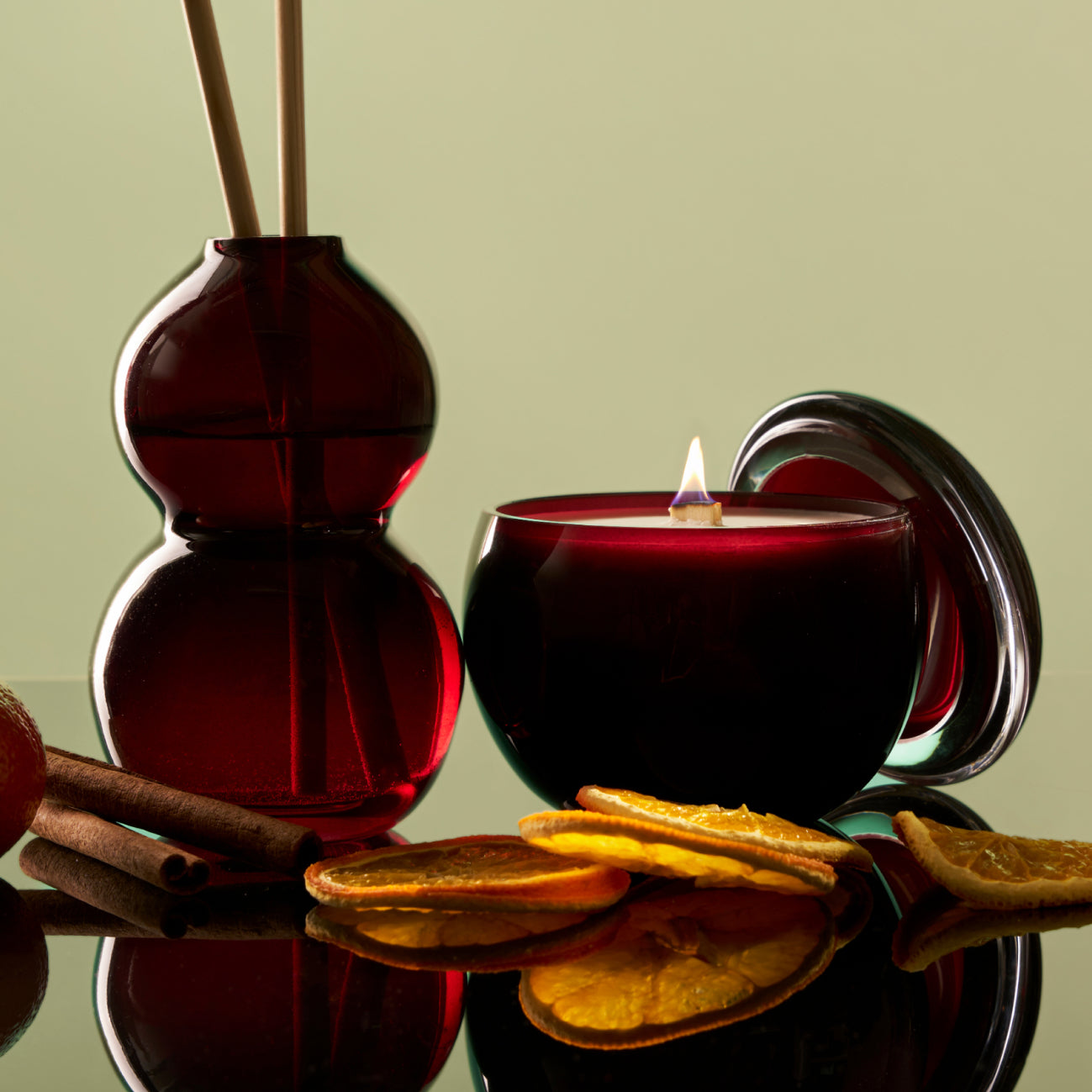 The glass bottles of the room fragrances and the glass jars of the scented soy wax candles are made in Finland and inspired by Aarikka’s iconic rounded design language. The wooden reeds are a piece of the pure forest, while the pinewood wick of the candles burns cleanly with low emissions, gently crackling to create a warm, atmospheric ambiance.